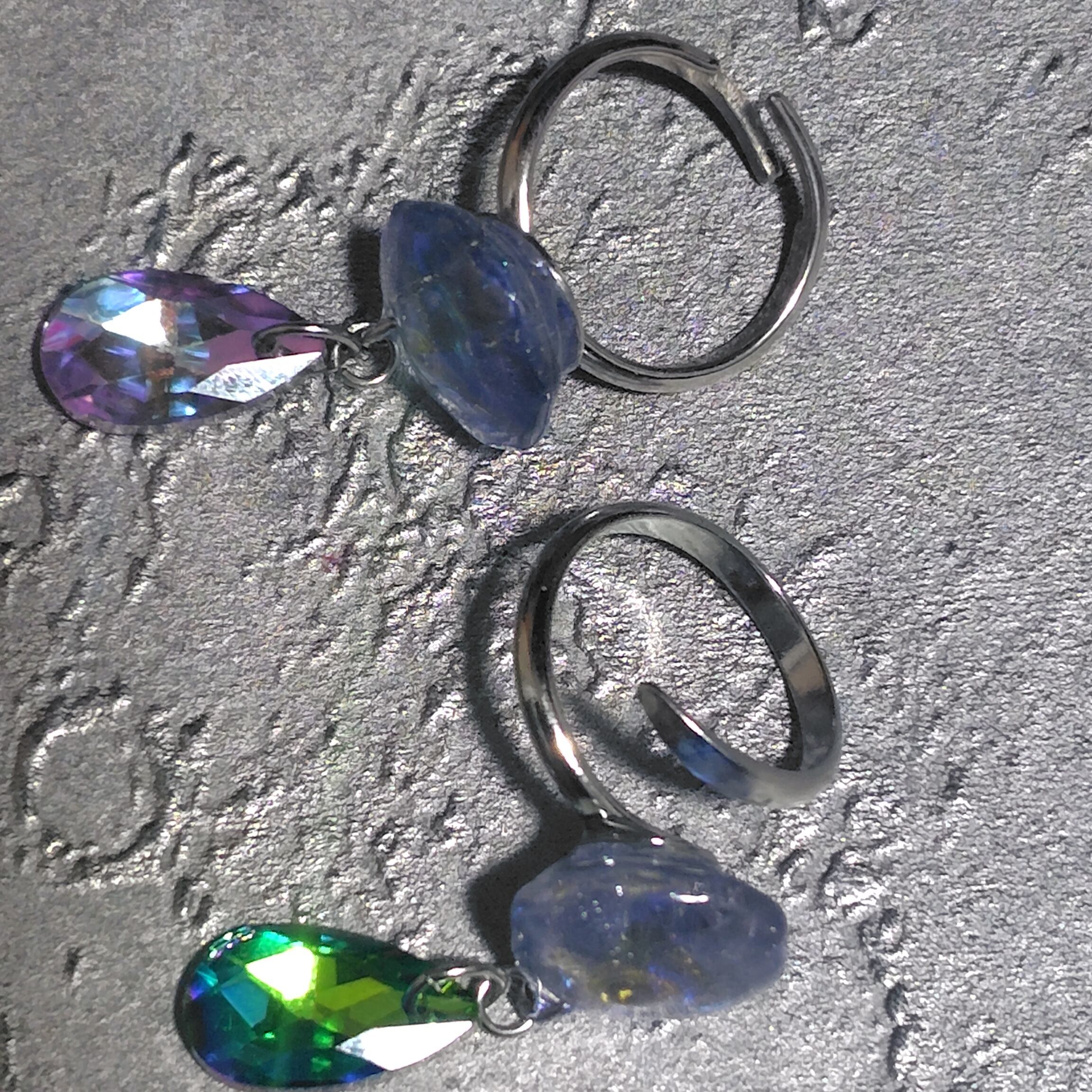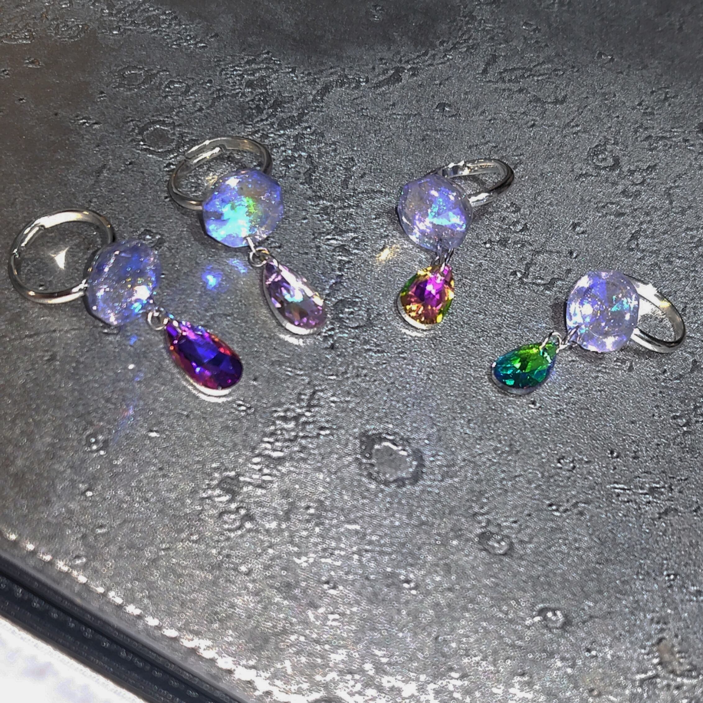 オーロラ色のサンキャッチャーにコーティングを施し、多面カットのガラスビーズを組み合わせた指輪です。PCのブルーライトや、終電後のタクシーのヘッドライト、眠れなかった朝の日差しも、あなただけのスポットライトに変えてくれる、小さなお守り。