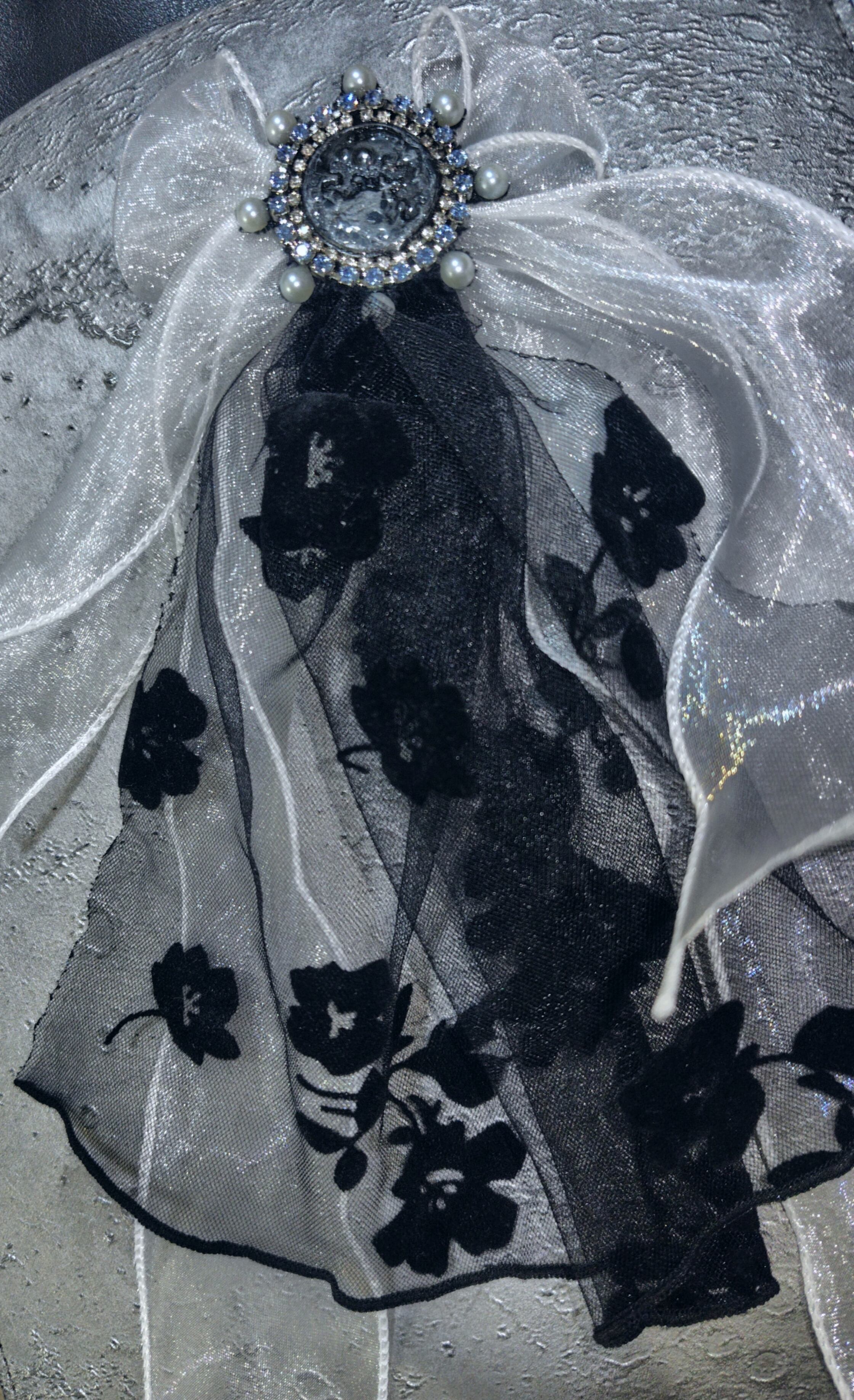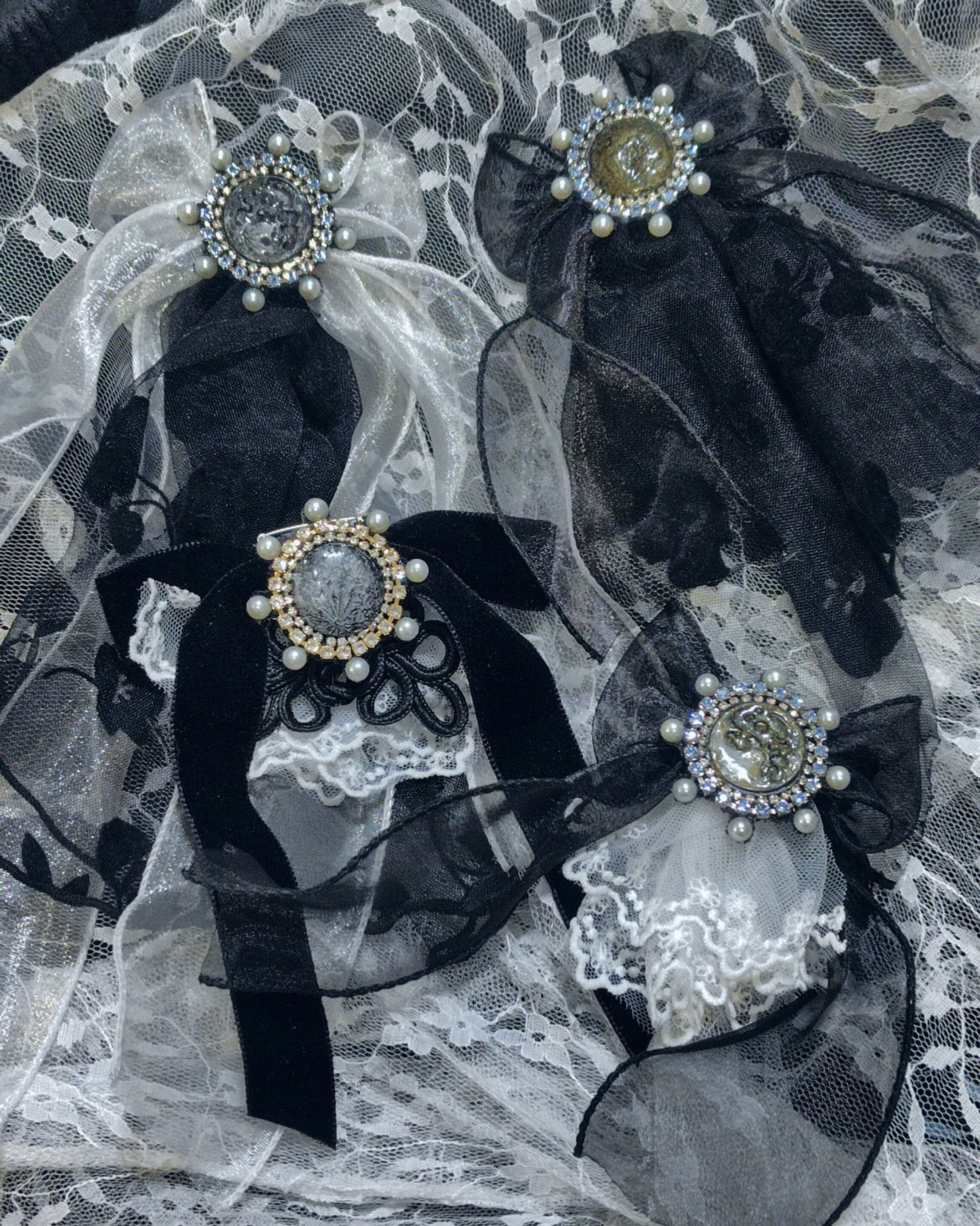 レジン製の満月に、リボンやレースをあしらって、あなたを照らす、唯一無二のアクセサリーに仕上げました。安全ピン・ヘアクリップ・フリーサイズの指輪付き。あなたのスタイルに合わせて身に着けてください。