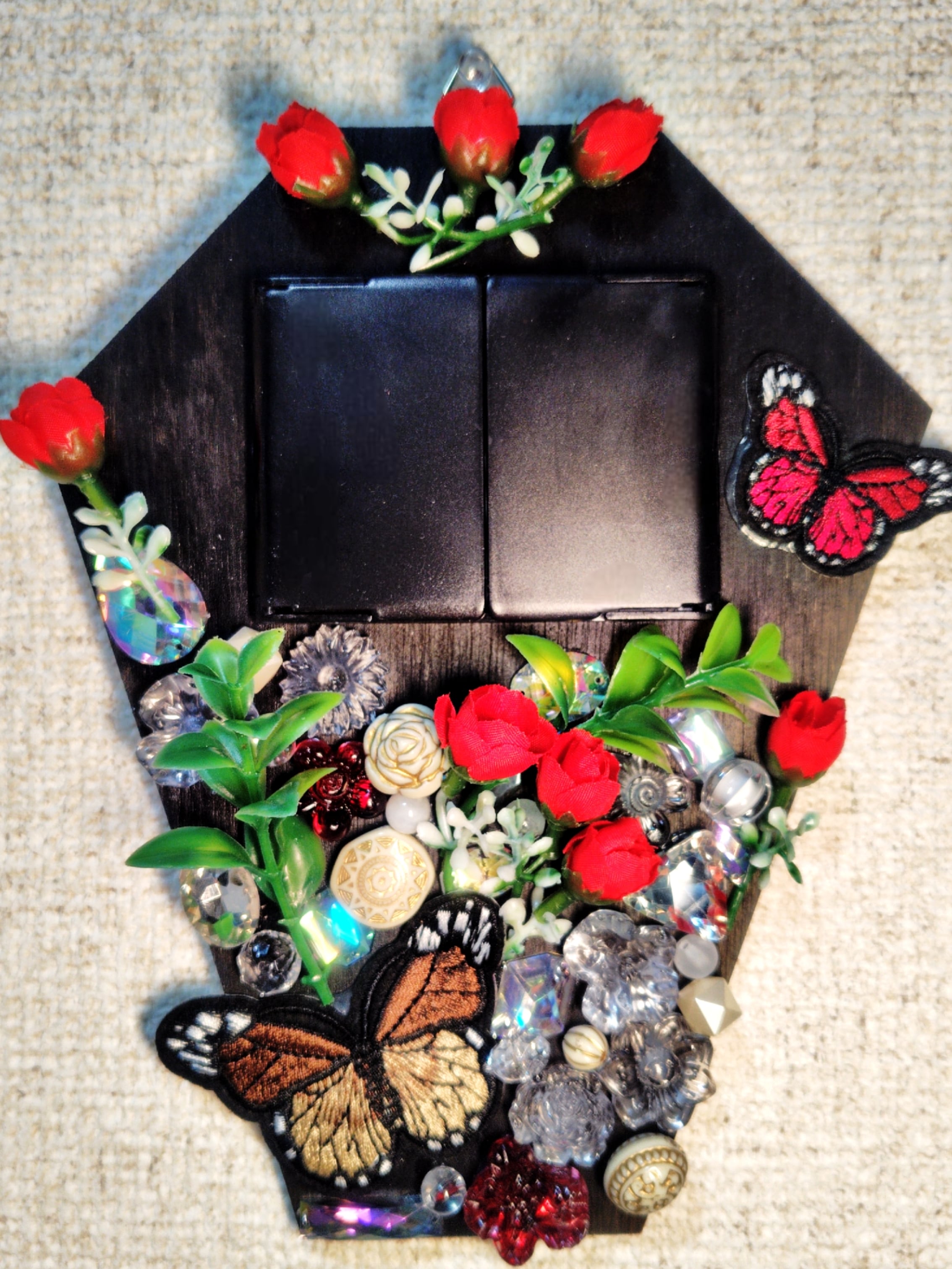 棺型の壁掛け飾り。拝顔窓にあたる位置には両開きの鏡をあしらいました。裏側には夜光昼夢のロゴが入っています。